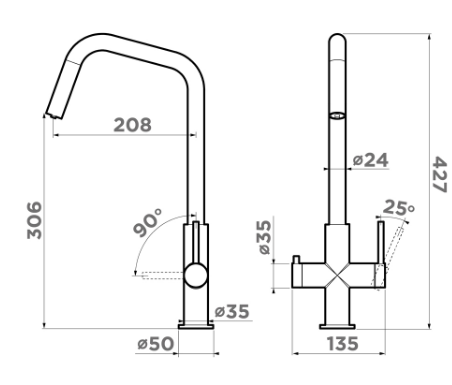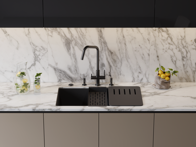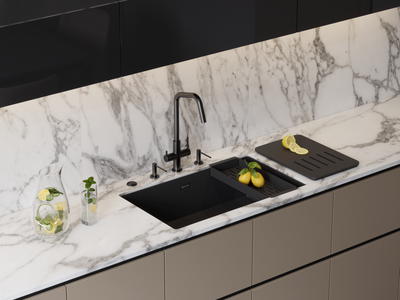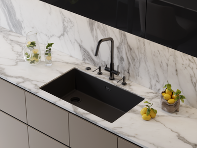 Прекрасно сочетается с мойками из композитного материала, акрилового или натурального камня, нержавеющей стали или керамики
